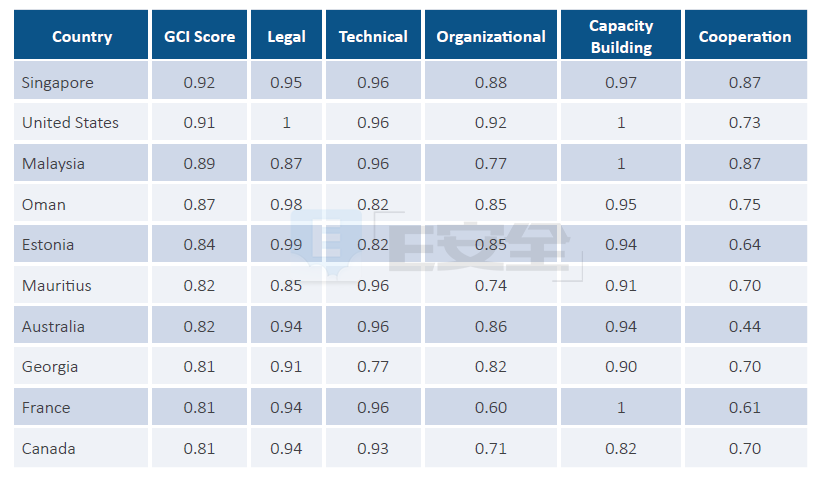 国际电联根据以下5方面因素对各国网络安全进行打分排名: